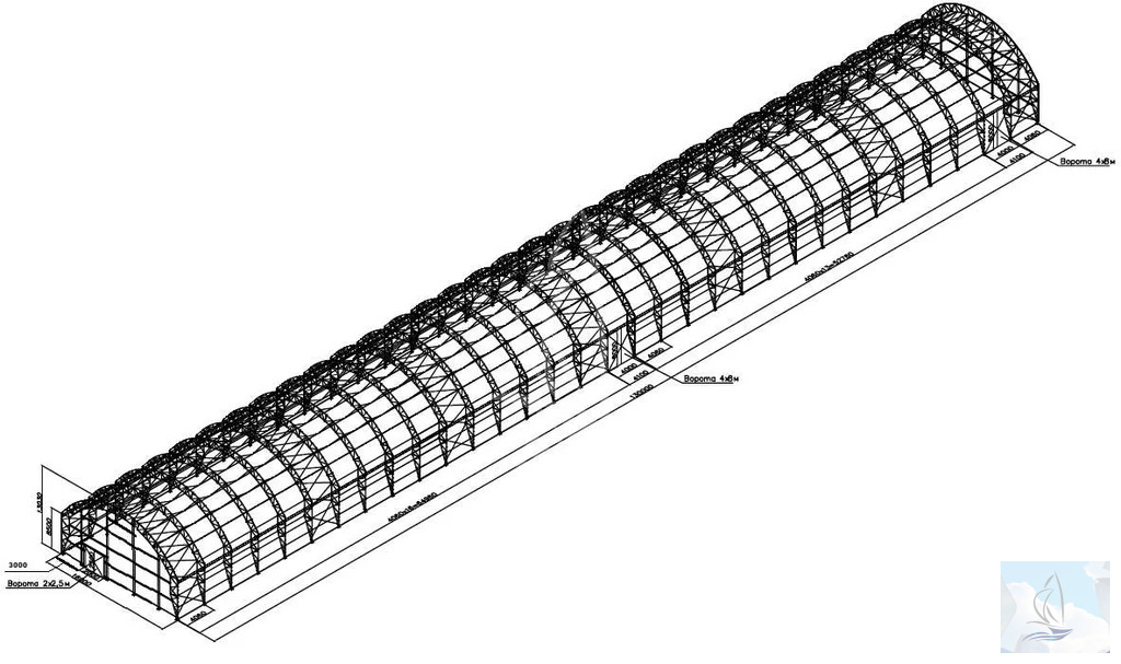 4 ворот по периметру, высота ворот — 8 м. Фура заходит.